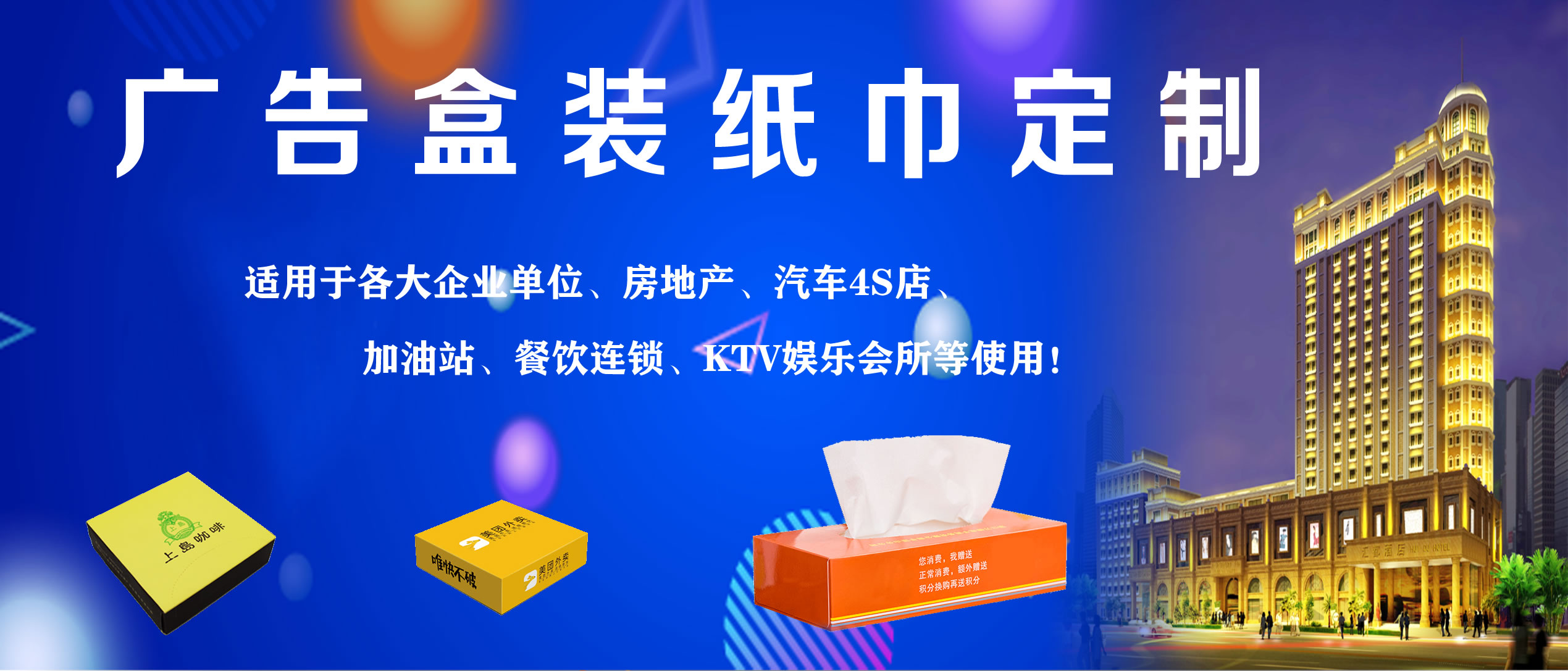 合肥億竹紙品包裝有限公司是一家專業(yè)從事各種生活用品定制的企業(yè),定制熱線:18919603840(周經(jīng)理)。公司與各大餐飲行業(yè)、酒店、加油站、學(xué)校、KTV娛樂會(huì)所、銀行、汽車4S店、房地產(chǎn)、廣告公司等客戶長(zhǎng)期合作,業(yè)務(wù)覆蓋安徽全省。公司主營(yíng)產(chǎn)品:廣告盒抽定制、餐巾紙定制、大盤紙、擦手紙、散抽紙等。有著完善的生產(chǎn)硬件設(shè)備和專業(yè)技術(shù),及長(zhǎng)期從事的豐富經(jīng)驗(yàn)。 我廠專注生活用品多年,致力于生產(chǎn)“精致,高端,綠色,健康”于一體的優(yōu)質(zhì)產(chǎn)品,以誠(chéng)信、實(shí)力和產(chǎn)品質(zhì)量獲得業(yè)界的認(rèn)可。目前我廠產(chǎn)品已深得寶馬汽車、重慶劉一手火鍋餐飲連鎖、萬達(dá)集團(tuán)、綠地集團(tuán)等眾多客戶的青睞,業(yè)務(wù)量不斷攀升。